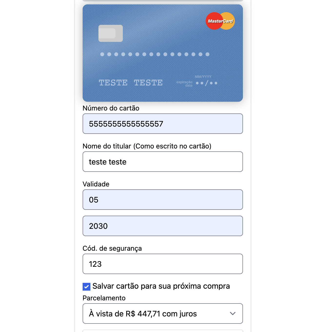 O Storefront 2.0 possui suporte nativo à exibição de Cartões Sugeridos (cartões previamente salvos pelo cliente em compras anteriores), desde que o parceiro retorne os cartões sugeridos pelo endpoint /payment-details. Isso ocorre automaticamente pelo template padrão, sem a necessidade de implementação manual de scripts ou estilos adicionais.